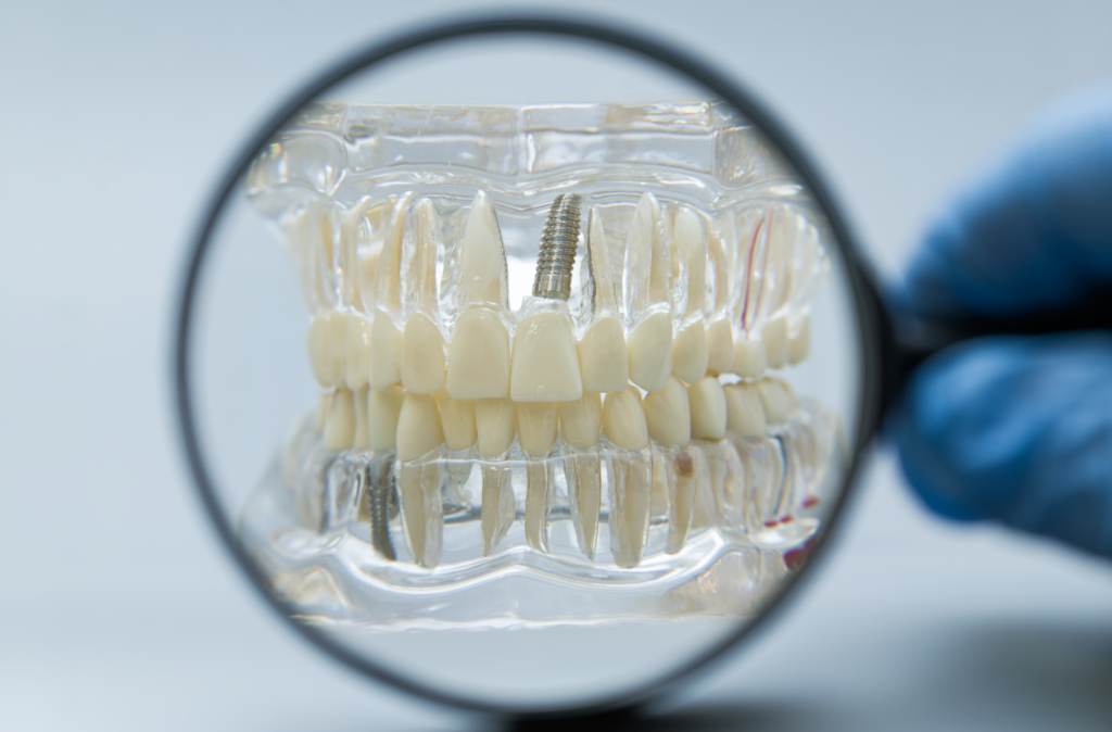 A dental implant is a durable and modern solution for replacing missing teeth. An implant is a small titanium screw that is surgically placed into the jawbone and functions as an artificial tooth root. After the implant integrates with the bone (osseointegration), a crown, bridge, or denture is placed on top to fully restore the missing tooth.